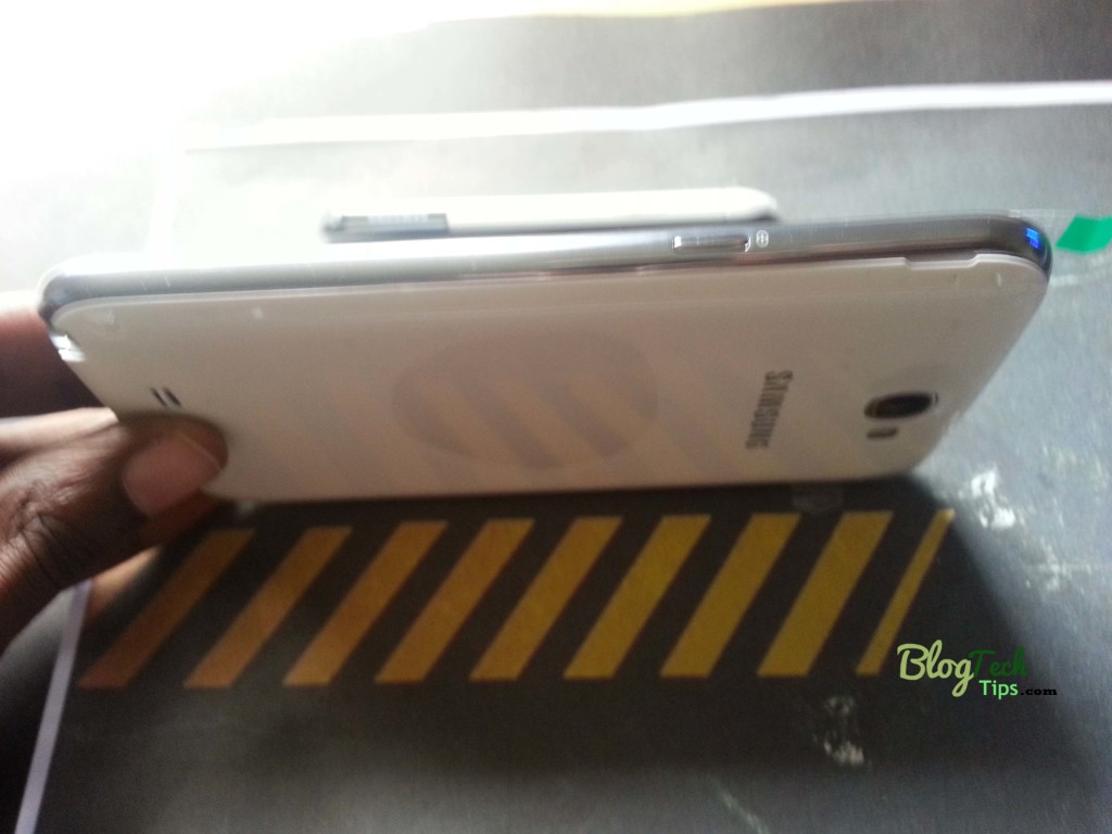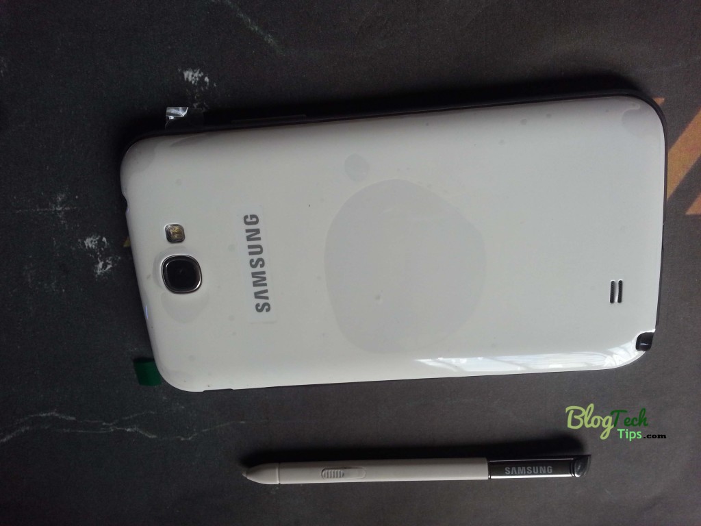 The S Pen of the Samsung Galaxy Note 2 is branded with the Samsung logo cast in a white plastic like material that seems quite durable by all appearances. The tip which allows for gripping is painted with a silver finish with the Samsung name etched into it. At the other end there is a elongated pressure sensitive tip that ends in a fine rounded blunt end that allows for detailed scribbling as you would with a regular pen. This works beautifully with the HD Super AMOLED Screen which readily accepts input from what seemed at first a gimmicky stylus, but it does grow on you over time.