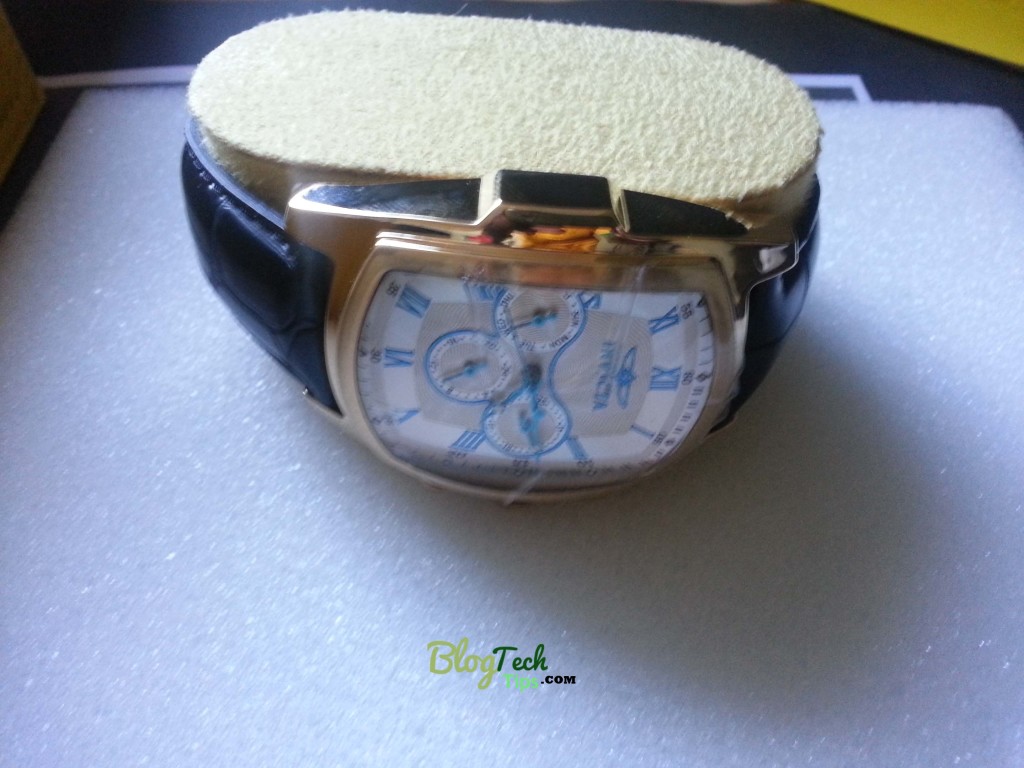 The centerpiece of the watch catches the eye immediately with it’s Gold bezel and Large print face,with clearly written symbols in the Roman and standard numbering system with a silver back drop. This allows the watch to look not only practical but also functional as well.